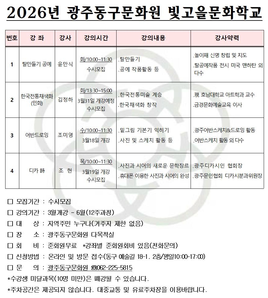 문화학교 [2026 빛고을문화학교] 수강생 신청안내